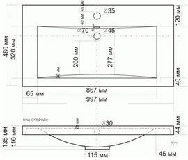 - Диаметр отверстия под смеситель: 35 мм