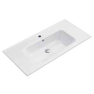 Тонкая белая глянцевая мебельная раковина с неглубокой чашей и отверстием под смеситель, ширина 95 см. Раковина с отверстием слив\перелив, расположение чаши в центре раковины. Донный клапан в комплект не входит, рекомендованный донный клапан DRR.1/WHT.