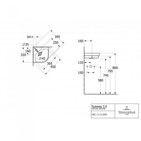 Раковина угловая Villeroy Boch Subway 3.0 32 x 32 см 43714601 Альпийский белый