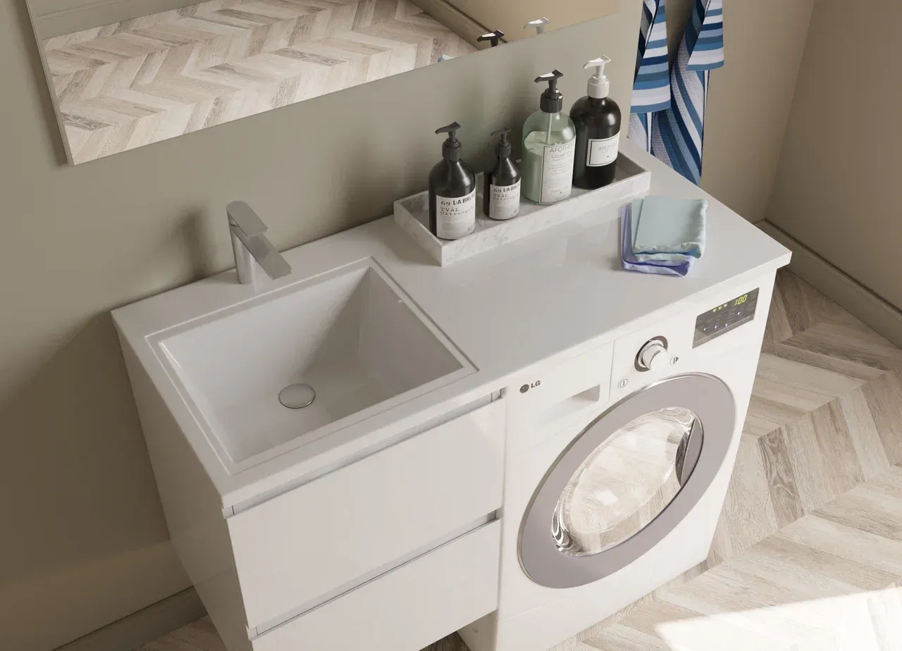 Изящнаая раковина гармонично впишется в любой интерьер ванной комнаты и позволит рационально использовать пространство над стиральной машиной.