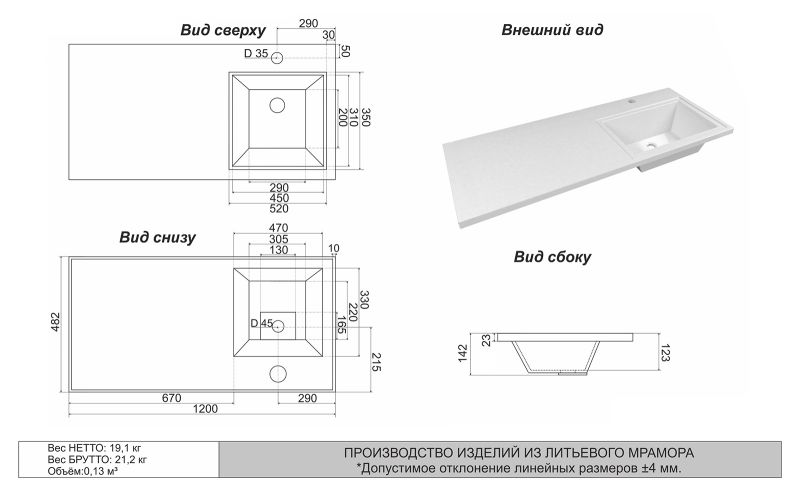 Тип: раковиныПо форме: прямоугольныеРазмер, мм (ШxГxВ): 1200x480x160Размер в упаковке, мм (ШxГxВ): 1230x510x190Цвет: белыйВес с упаковкой, кг: 25.3По монтажу: мебельнаяМатериал: литьевой мраморОсобенности: установка над стиральной машиной, со столешницей