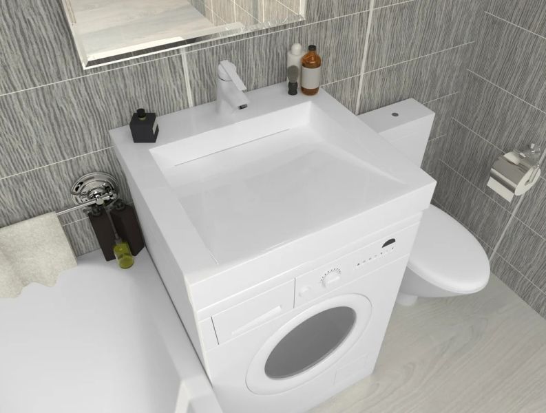 Ультрасовременная раковина в ванную комнату для установки над стиральной машинкой с щелевым сливом. Крепится на кронштейны, которые входят в комплект поставки. Верхний слой высококачественного гелькоута образует декоративно-защитное покрытие.