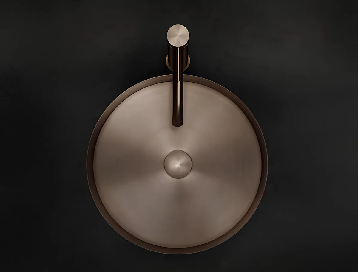 Отделка в цвете Black Metal Brushed PVD придаёт поверхности глубокий графитовый оттенок с деликатной сатинированной текстурой. Такое исполнение подчёркивает строгость линий и визуально выделяет раковину на фоне светлой или натуральной отделки.