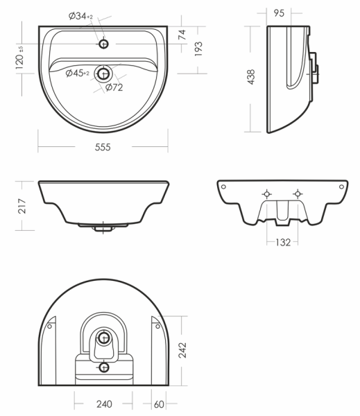 Размеры умывальника 555 x 438 x 217