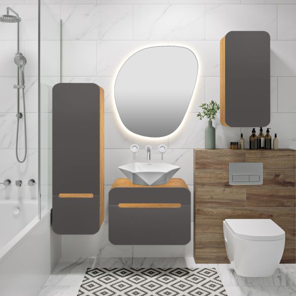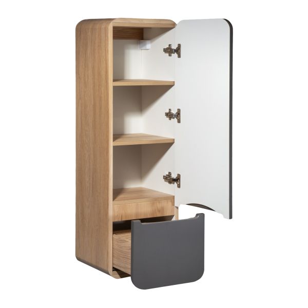 Шкаф-пенал для ванной RUNO НИЦЦА - сочетание безупречного стиля и современных тенденций в дизайнерском оформлении ванной комнаты. Пенал с обтекаемыми формами станет прекрасным дополнением в интерьере Вашей ванной комнаты, выполнен в сочетании корпуса с текстурой светлого натурального дерева с фасадами цвета графит. Плавные линии в сочетании с фактурным покрытием сделают обстановку вашей ванной максимально теплой и уютной. Придаст изысканность и завершенность домашней обстановке. Шкаф оснащен одной распашной дверцей правого открывания и выдвижным ящиком с бесшумными шариковыми направляющими полного выдвижения, навесами для крепления к стене. Внутри шкафа две внутренние полки. Функцию ручки выполняет декоративный вырез. Фасады шкафа-пенала изготовлены из МДФ. Мебель для ванной RUNO - красота и практичность в мелочах! Цвет товара на мониторе может отличаться от реальных цветов, это зависит от настроек цветового профиля и разрешения Вашего монитора или мобильного устройства.