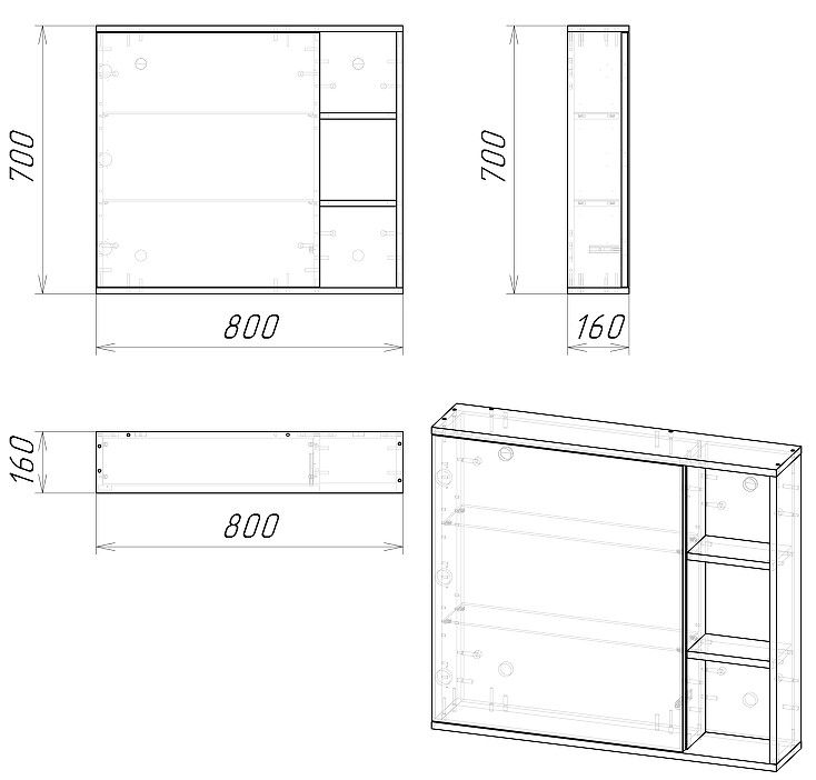 Шкаф-зеркало имеет универсальную ориентацию: верх и низ шкафа можно менять местами, а дверца может открываться как влево, так и вправо.