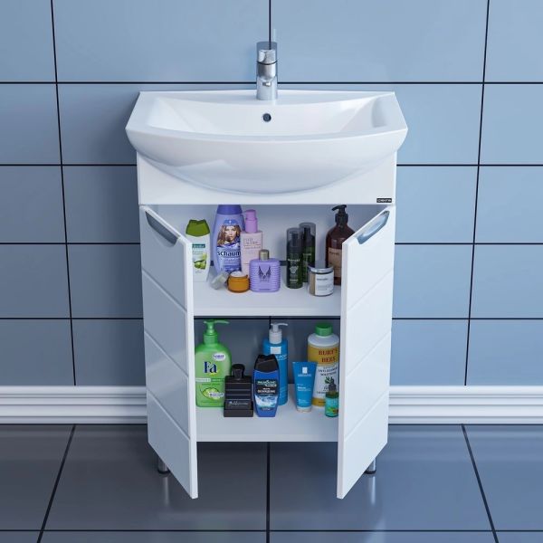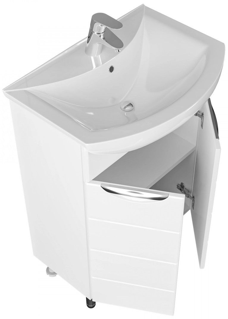 Несмотря на небольшие размеры, шкаф достойно выполнит задачу по хранению: пространство за распашной дверцей с механизмом плавного закрывания позволяет разместить необходимые мелочи, а открытые полки можно использовать для декора или часто используемых предметов.