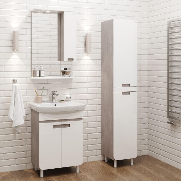 Уникальность шкафа в его дизайне: корпус цвета бетона и фактурой мешковины отлично сочетается с белым глянцевым фасадом с закругленными углами.
