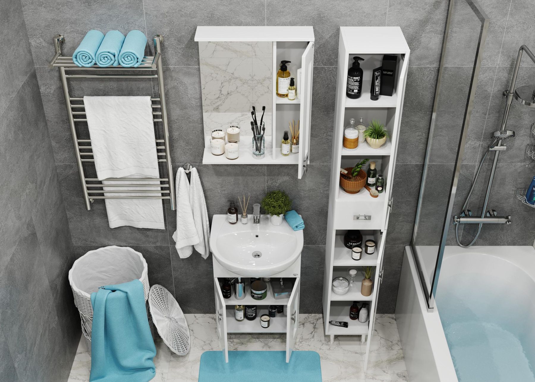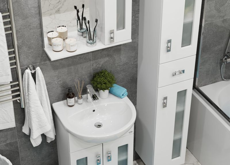 Белоснежный цвет фасада в сочетании со вставками из матового стекла и хромированными ручками необычной формы придадут ванной комнате ощущение свежести, чистоты и уюта.