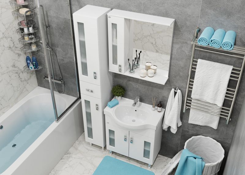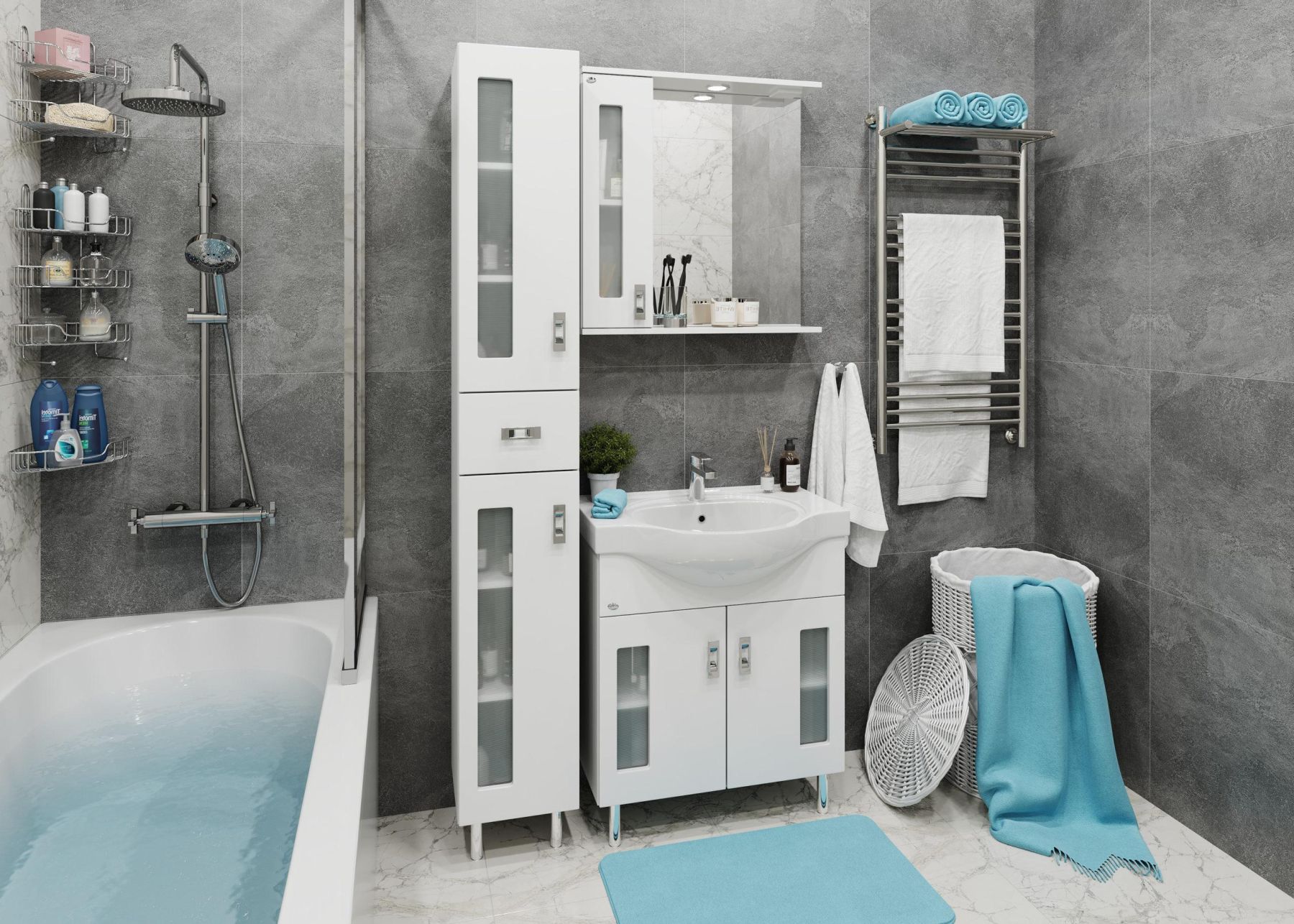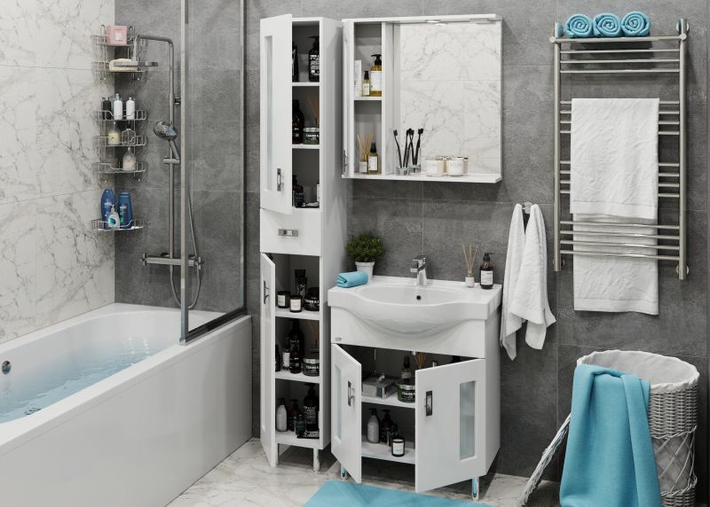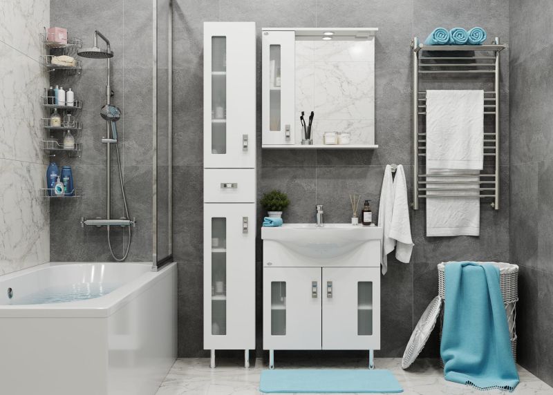 Белоснежный цвет фасада в сочетании со вставками из матового стекла и хромированными ручками необычной формы придадут ванной комнате ощущение свежести, чистоты и уюта.