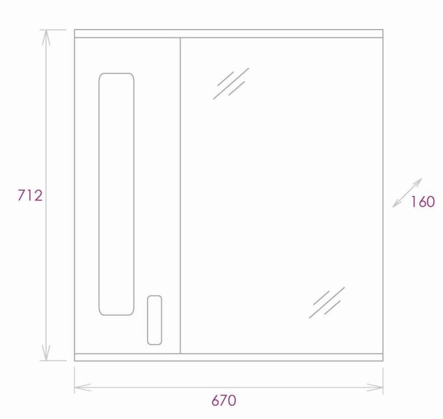 Слева от зеркала за распашной дверцей с механизмом плавного закрывания расположено отделение для хранения, разделенное полкой, под зеркалом - открытая полочка для косметических средств или декоративных элементов.