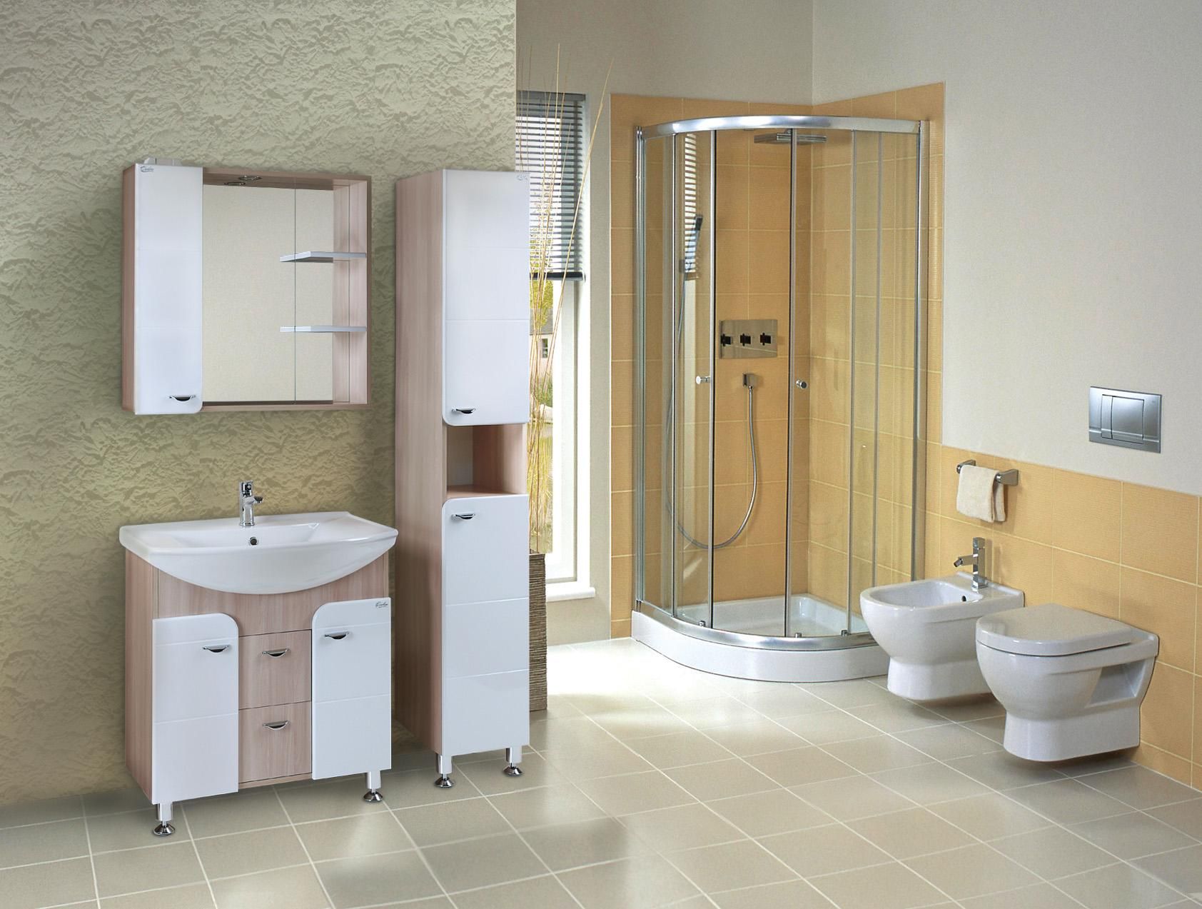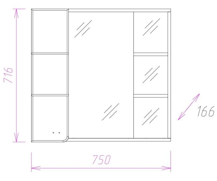 Слева от зеркала за распашной дверцей с неброской горизонтальной фрезеровкой и механизмом плавного закрывания, расположено отделение для хранения, разделенное полкой. Справа от зеркала и под ним - открытые полочки для косметических средств или декоративных элементов.