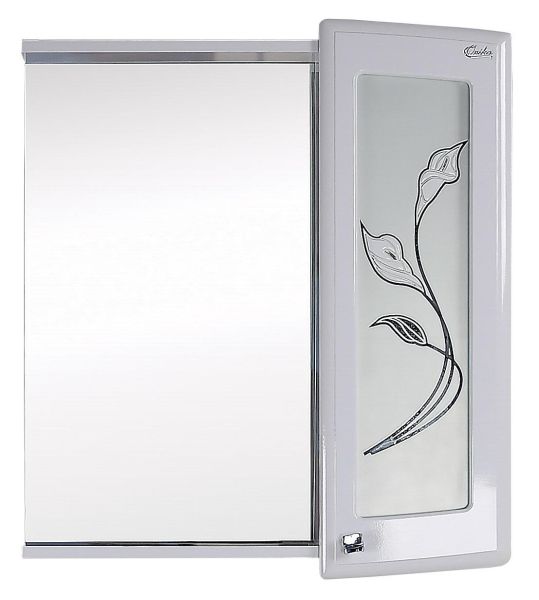 Эстетика шкафа представлена белоснежным глянцевым фасадом, вставкой из матового стекла с изящным цветочными рисунком и хромированной элегантной фурнитурой.