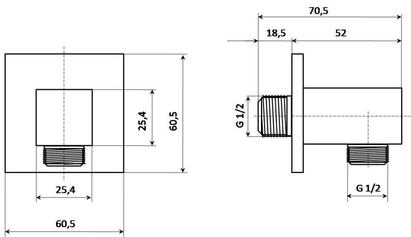 Вертикальный настенный монтаж и компактные размеры (6,05×6,05 см) делают подключение удобным для интеграции в ограниченное пространство. Отсутствие запорного клапана и держателя для лейки подчеркивает minimalistчный подход, ориентированный на совместимость с различными сантехническими системами. Модель предназначена для стандартного подключения шлангов и других аксессуаров, обеспечивая стабильную подачу воды.