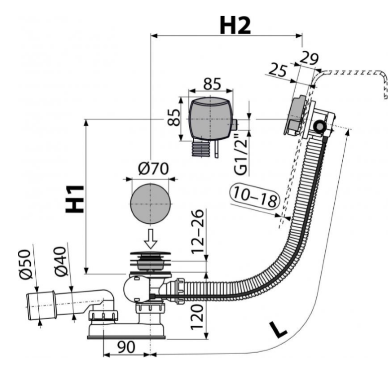 Слив-перелив для ванны AlcaPlast с напуском воды через перелив для ванн с толстыми стенами 57см хром A565CRM1