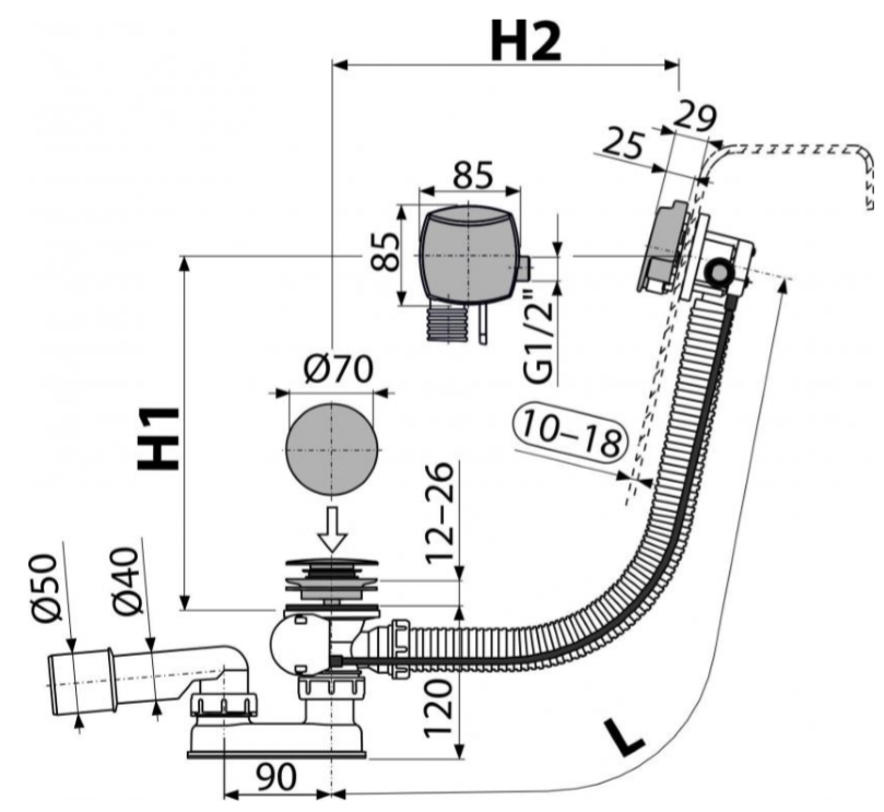 Слив-перелив для ванны AlcaPlast с напуском воды через перелив для ванн с толстыми стенами 80см хром A565KM1-80 купить