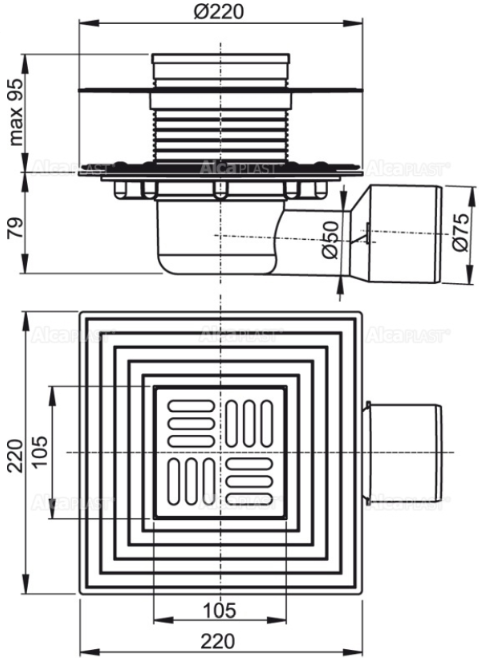 Сливной трап AlcaPlast 105 ? 105/50/75мм решетка - хром APV3344 купить