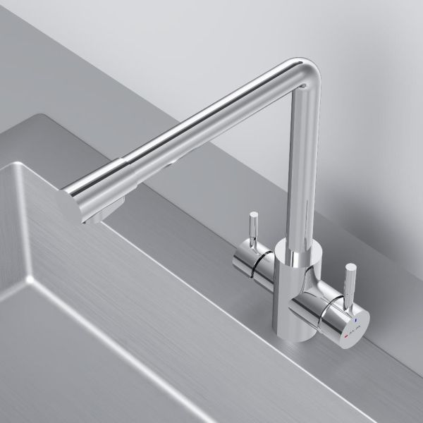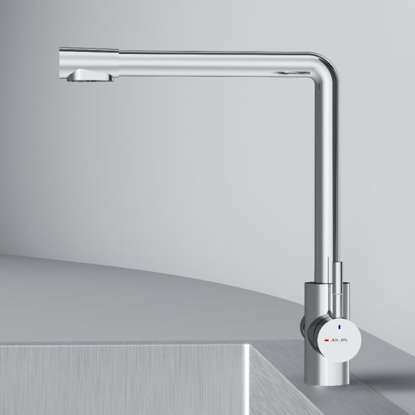 Смеситель оснащен встроенным каналом для питьевой воды. Для получения питьевой воды воспользуйтесь ручкой, расположенной с левой стороны корпуса, для получения обычной воды, просто управляйте смесителем привычным способом.