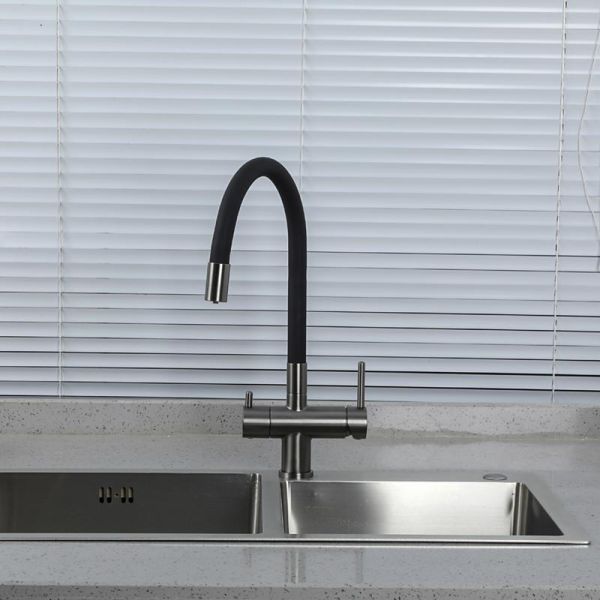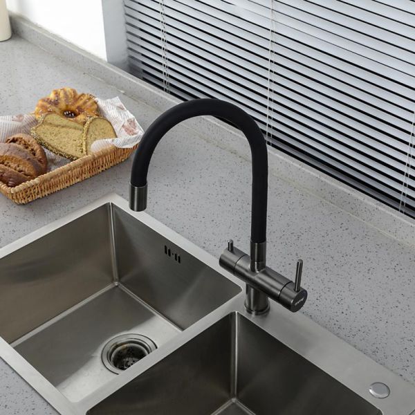 Смеситель для кухонной мойки Gappo G4398-39 под фильтр - стильная и практичная однорычажная модель с гибким изливом, отличается наивысшей функциональностью и удобством пользования в быту. Смеситель легок в установке, не требуется сверления дополнительных отверстий под фильтр. Модель имеет компактный рычажок для подачи воды из-под фильтра, а второй рычаг отвечает за регулировку потока. Однорычажное управление обеспечивает плавную настройку температуры и регулировку напора воды. Цвет - оружейная сталь.