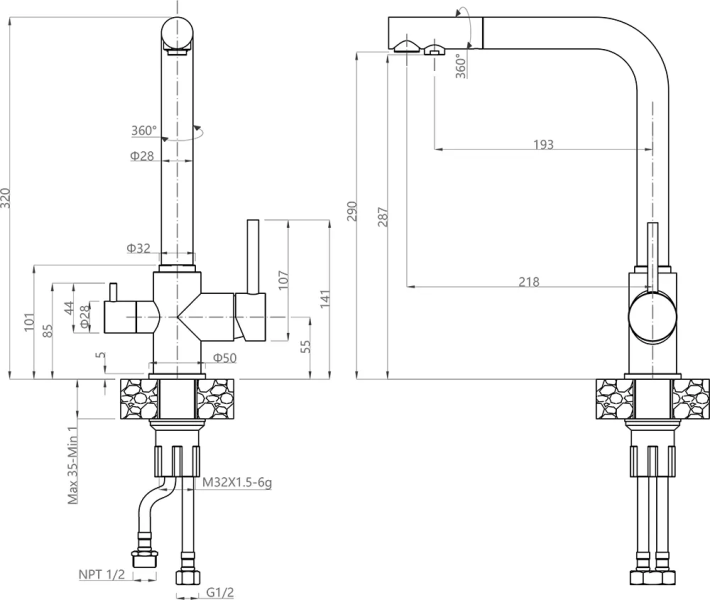 • Высота смесителя: