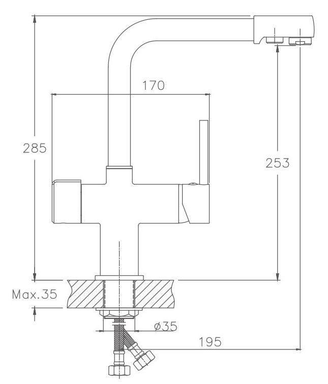 Смеситель для кухни бренда Haiba.Изготовлен из латуни.Картридж 35 мм.Укомплектован аэратором.Гибкая подводка 40 см. С поворотным изливом