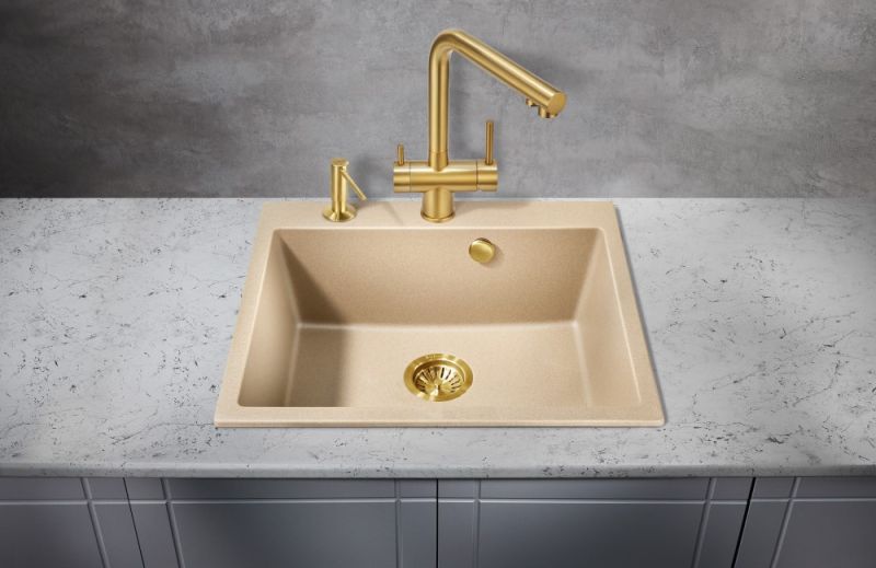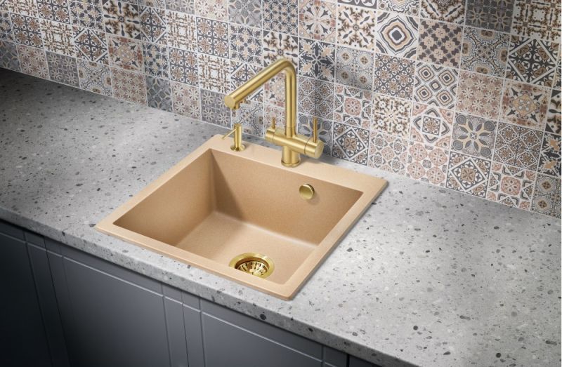 Модель выполнена в благородном цвете брашированного ( матового ) золота, которое достигается путём нанесения PVD, благодаря чему станет яркой, привлекающей внимание деталью на кухне и никого не оставит равнодушным.