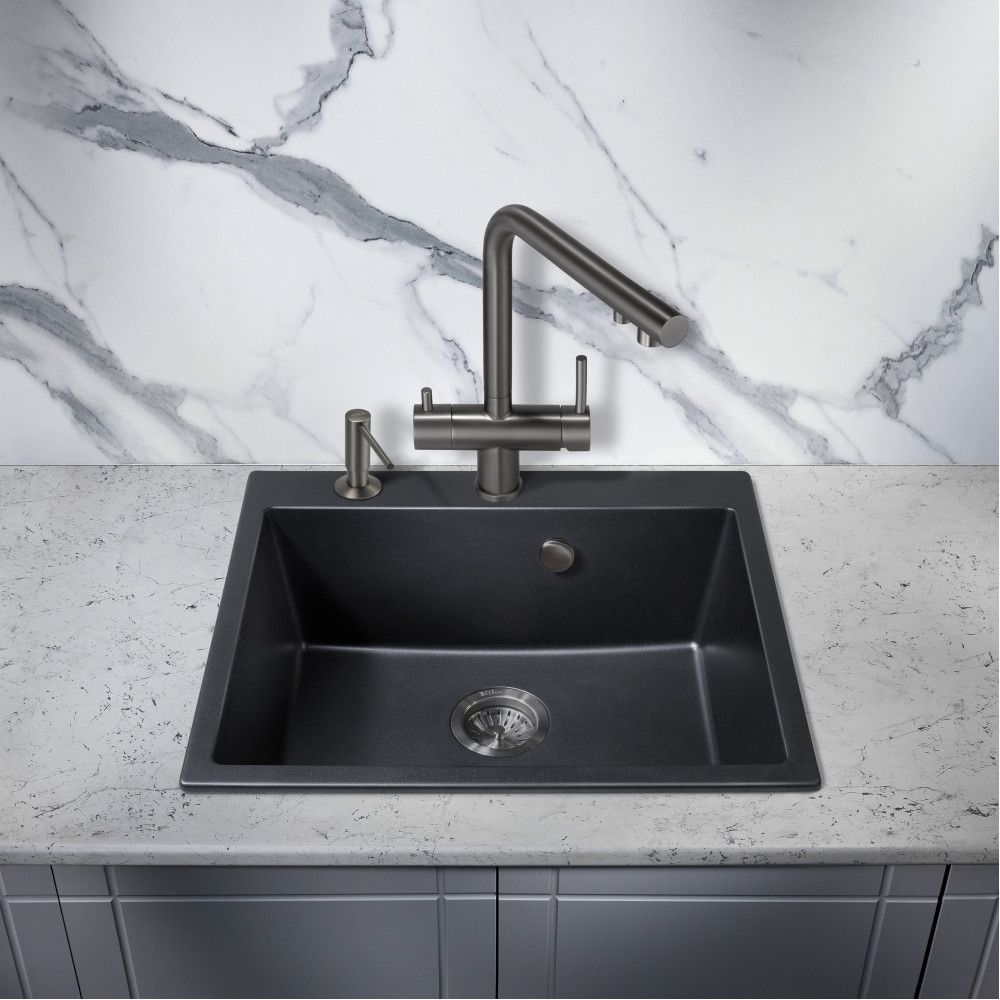 Модель выполнена в благородном цвете вороненая ( оружейная ) сталь и имеет изящный изогнутый кран, благодаря чему станет яркой, привлекающей внимание деталью на кухне и никого не оставит равнодушным.