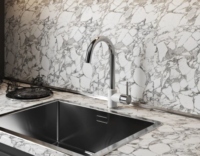 - Высокий корпус и поворотный излив дает больше возможностей при использовании на кухне.