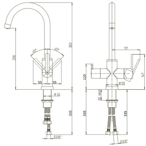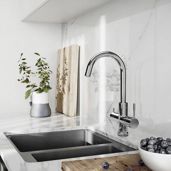 • Высокий корпус и поворотный излив дает больше возможностей при использовании на кухне.