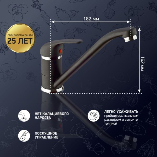 Все дело в цвете! Интересное решение для любителей традиционных моделей смесителей для кухни – PAINI JOLLY. Однорычажный смеситель с поворотным изливом обладает обтекаемой формой, знакомой и привычной многим. В этот раз этот популярный смеситель представлен в необычных цветах, что дает простор творчеству и позволяет сочетать его с мойками и кухонной мебелью разных фактур и материалов.Разнообразие цветаБелый с вкраплениями (гранит), комбинация черного и хромого цветов в корпусе смесителя, и три варианта бежевого цвета: сахара, бежевый с вкраплениями (гранит) и нежный трюфель. Теперь точно получится попасть в цвет столешницы и/или цвет мойки либо создать контрастные сочетания. Все варианты покрытия выполнены по специальной технологии, сохраняющей цвет и фактуру надолго и облегчающей уход за смесителем.Европейское качествоСделано в Италии. Гарантия – 5 лет.Технологии гарантируют долгий срок службыАэратор Neoperl наполняет поток воды кислородом, увеличивает напор, экономя воду. Одно движение пальцем для очистки сеточки. Nuovo Galatron - керамический картридж – основа, необходимая для долгой работы смесителя.Легкая уборкаМыльная губка и сухая тряпочка – все, что нужно для уборки. Несколько движений – и готово.