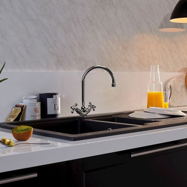 - Благодаря высокому корпусу и поворотному изливу идеально подходит для кухни.
