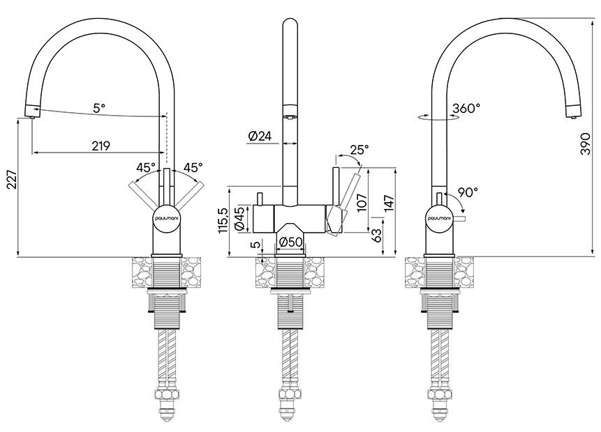 Смеситель для кухни, с возможностью подключения фильтра питьевой воды, артикул He213218-BGИзготовлен из нержавеющей стали AISI 304. Нержавеющая сталь AISI 304 легирована никелем, марганцем, медью и хромом, что обеспечивает ей повышенную прочность и устойчивость в коррозионных средах, такая сталь подвержена деформациям.