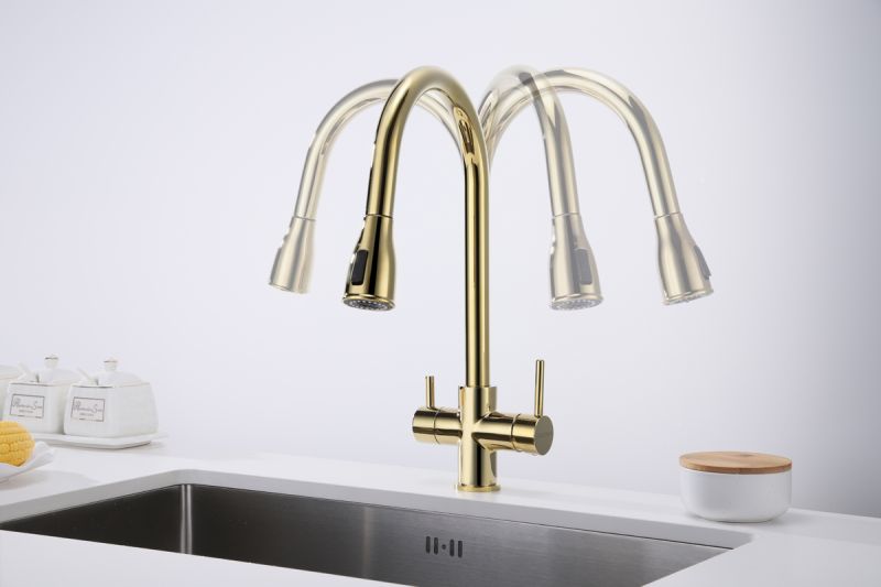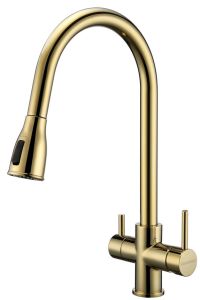 Смеситель под фильтрованную воду с выдвижным шлангом, артикул La214212-GИзготовлен из высококачественной латуни, которая отвечает высочайшим европейским стандартам качества, не содержит свинца, не разрушается со временем и безопасна для здоровья.Вытяжной шланг