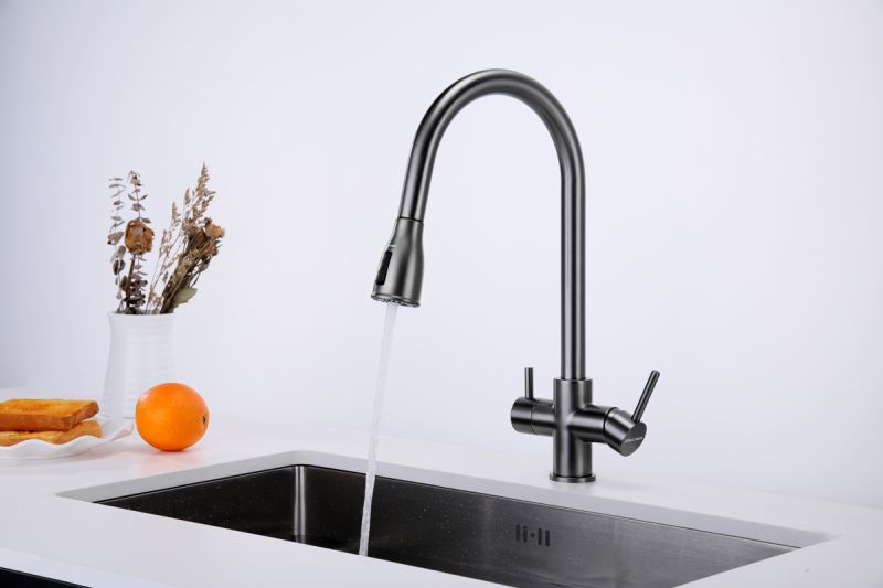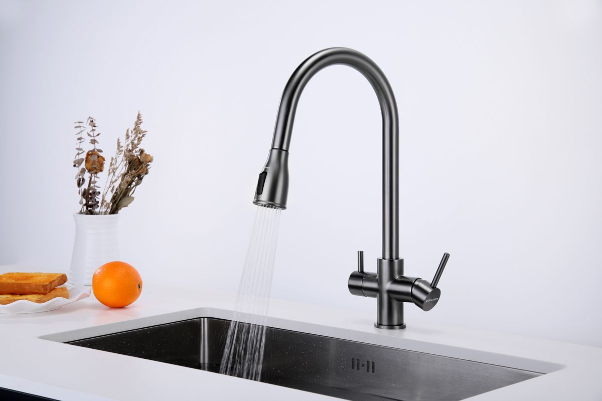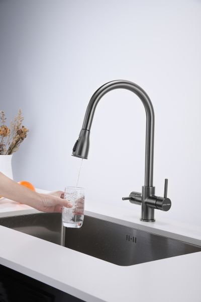 Смеситель под фильтрованную воду с выдвижным шлангом, артикул La214212-GMИзготовлен из высококачественной латуни, которая отвечает высочайшим европейским стандартам качества, не содержит свинца, не разрушается со временем и безопасна для здоровья.Вытяжной шланг