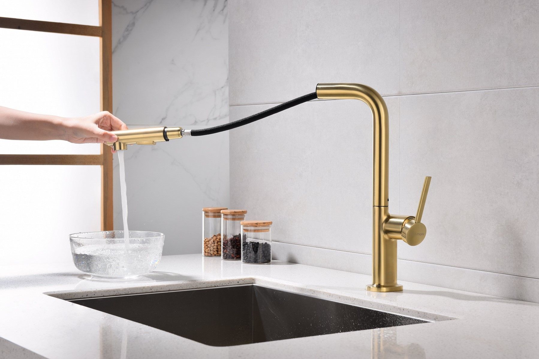 Высокий Г-образный излив с функцией вращения на 360 градусов обеспечивает удобство использования. Выдвижная часть излива способна обеспечить максимально комфортную эксплуатацию и экономный расход воды.