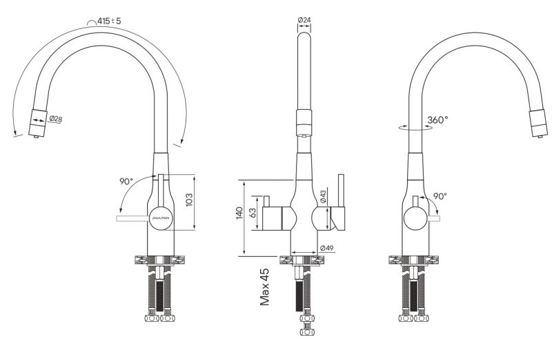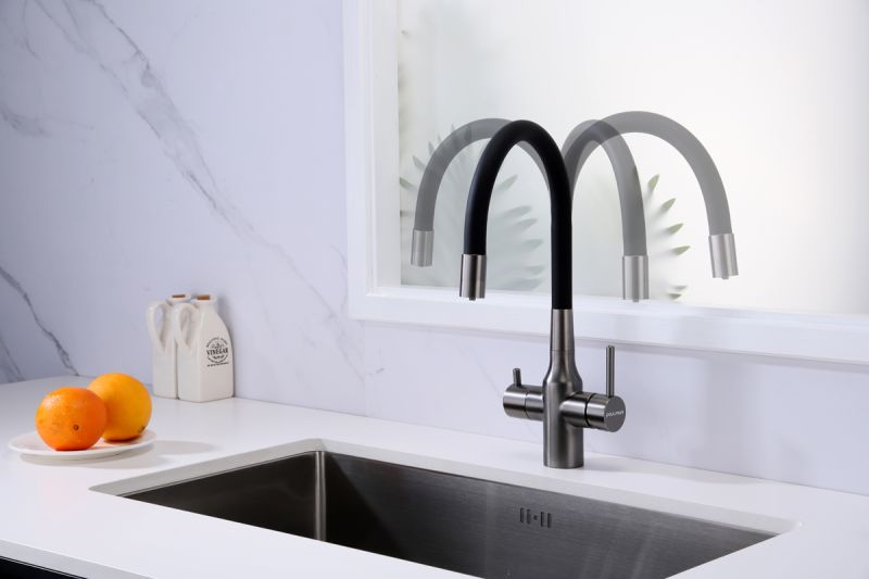 Смеситель под фильтр с гибким изливом, артикул Sa213419-GMСмеситель для кухни с возможностью подключения фильтра питьевой воды, эластичный излив с фиксацией.