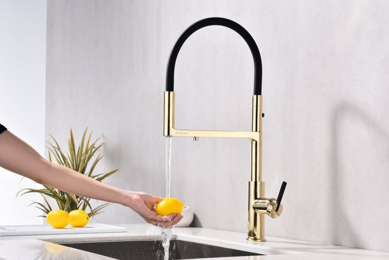 Смеситель для кухни, с гибким изливом, артикул To213402-GИзготовлен из высококачественной латуни, которая отвечает высочайшим европейским стандартам качества, не содержит свинца, не разрушается со временем и безопасна для здоровья.Гибкая подводка 40 см;