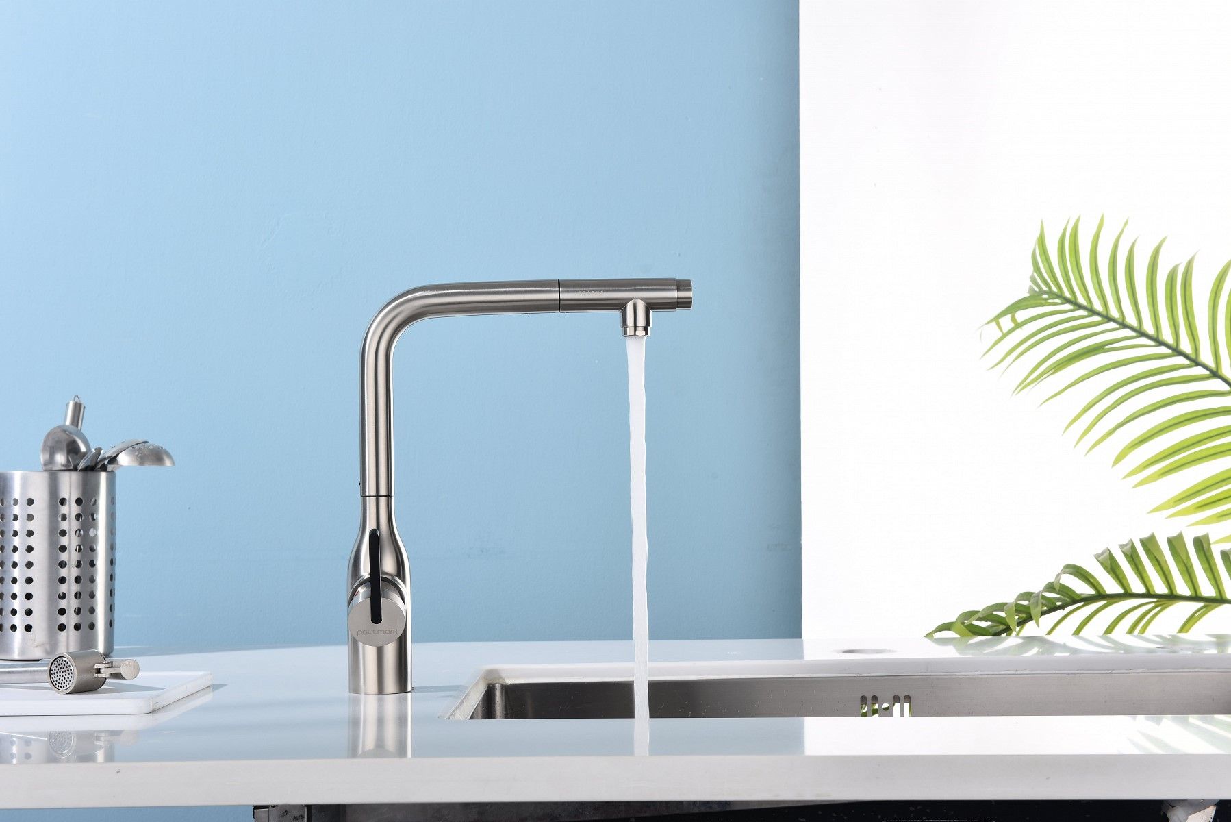 Высокий Г-образный излив с функцией вращения на 360 градусов обеспечивает удобство использования. Выдвижная часть излива способна обеспечить максимально комфортную эксплуатацию и экономный расход воды.