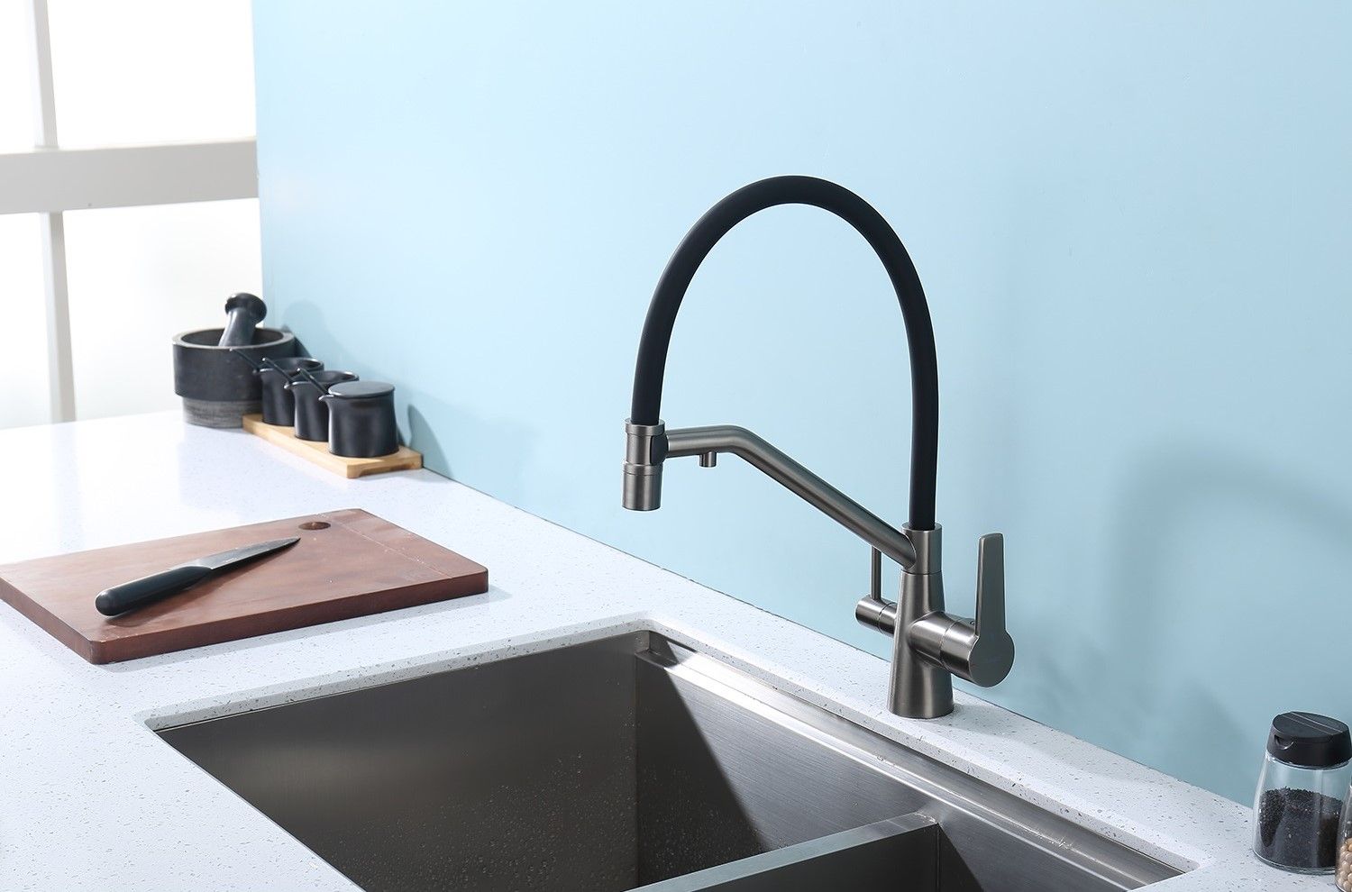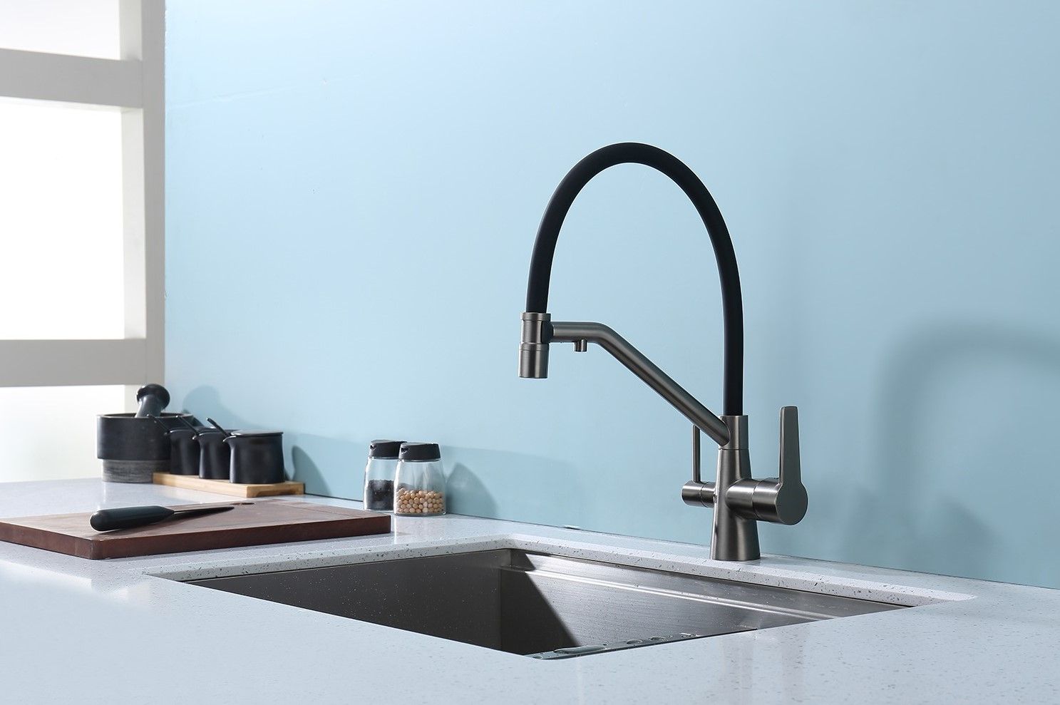Смеситель для кухни со съемным изливом на магните и подключением фильтра питьевой воды. Гибкий съемный шланг значительно расширяет зону использования смесителя, благодаря этому можно мыть объемную посуду. Модель предназначена для одновременного подключения к водопроводу и фильтру и позволяет снабжать как обычной, так и питьевой водой.