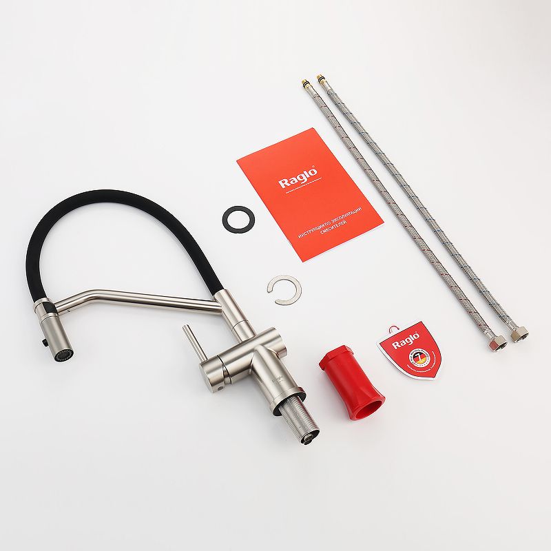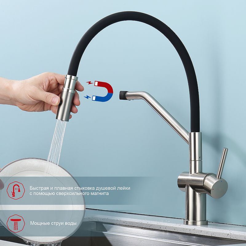 Смеситель для кухни со съемным изливом на магните. Кухонные смесители торговой марки RAGLO– это оригинальность и уют для каждого дома. Кран выполнен из высококачественных материалов, что гарантирует его долговечность и надежность. Эта сантехника отличается полезным функционалом, экологичными решениями, оригинальным стилем и легкостью монтажа. Поворотный излив позволяет с большим удобством пользоваться им на кухне. Оснащен гибкой системой подключения, что облегчает его монтаж и установку. Встроенный аэратор эффективно фильтрует примеси и уменьшает шум от импульсов воды. Гладкая внутренняя стенка обеспечивает мягкий поток воды. Подходит к кухонным мойкам практически любых размеров и форм. Кухонный смеситель является неотъемлемой частью любой кухни, и данный смеситель - отличный выбор для тех, кто ценит качество, надежность и комфорт.