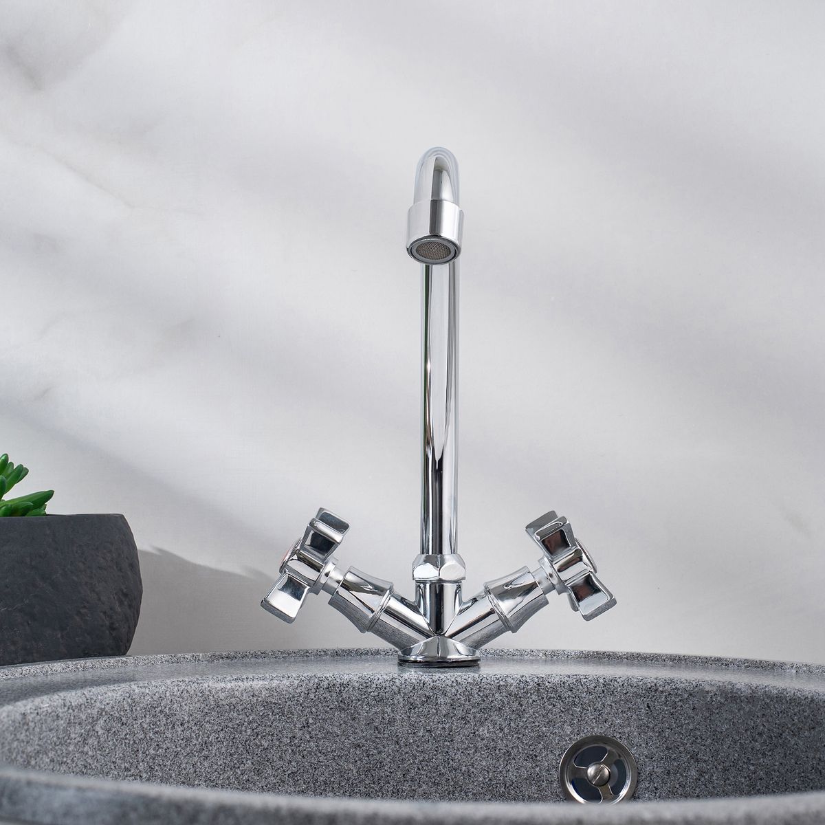 Стильный двуручковый смеситель для кухни с высоким поворотным изливом станет эффектным и эффективным решением для вашего интерьера.