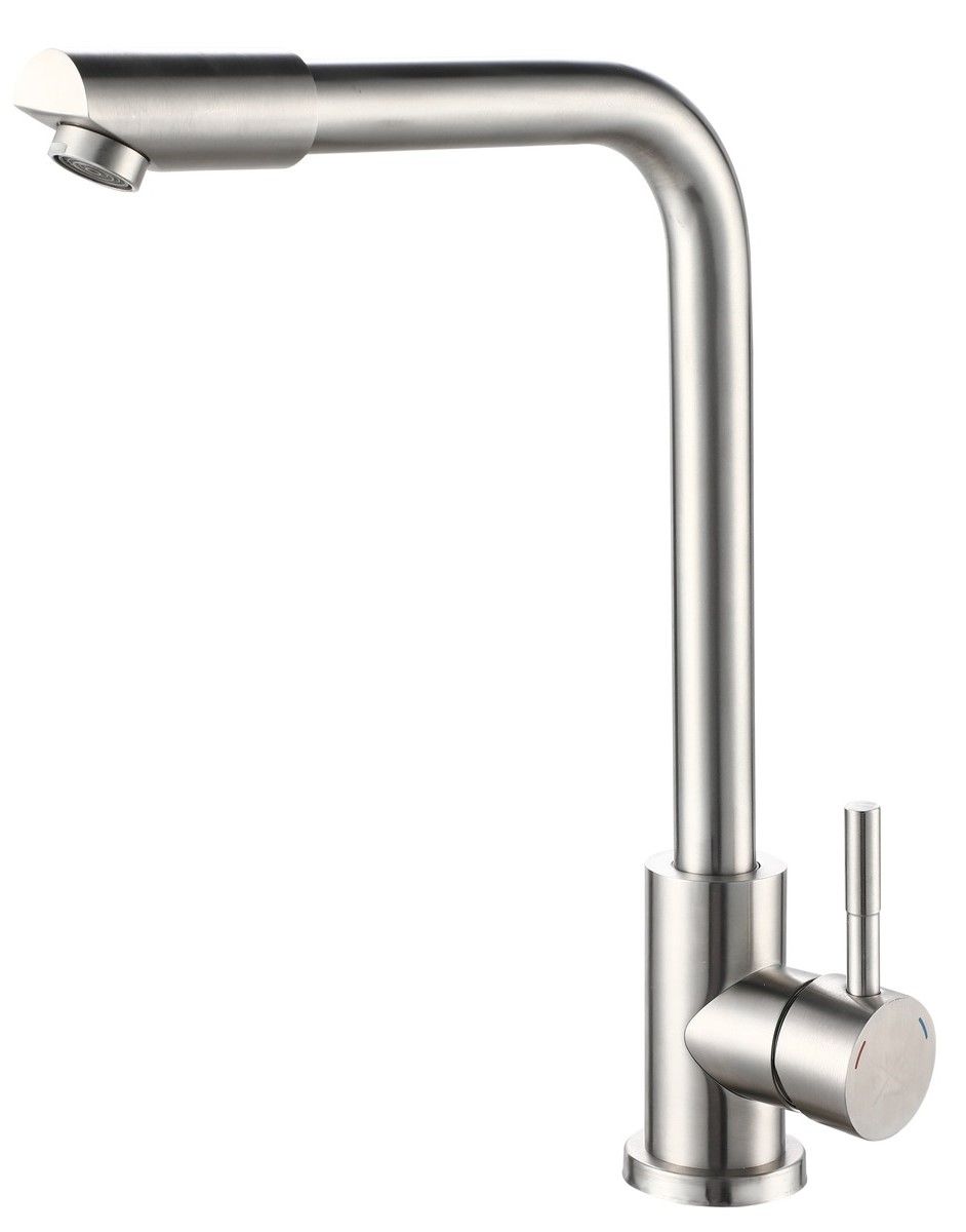 Одноручковый смеситель для кухни из нержавеющей стали с высоким изливом прекрасно подойдет для мойки любого размера, обладает наклонным аэратором.