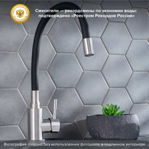Одноручковый смеситель для кухни из нержавеющей стали с гибким изливом прост и удобен в использовании.