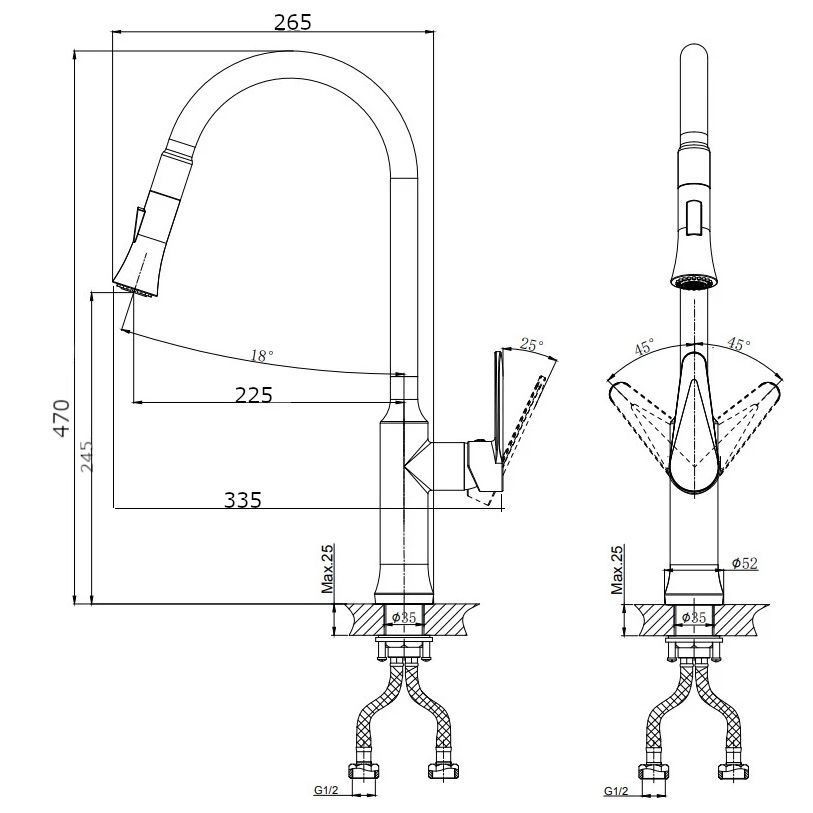 Смеситель для кухни RUSH арт. DN0335-23 с поворотным изливом и вытяжной лейкой из коллекции Denis с металлической ручкой, изготовлен из высококачественной латуни и имеет рычажное управление. В смеситель установлен картридж D-35 с керамическими пластинами. Высота смесителя 486 мм. Излив поворотный 225 мм. Высота излива до аэратора 245 мм. Аэратор изготовлен из пластика с нержавеющим корпусом, угол наклона аэратора-18гр. В комплекте универсальная присоединительная группа для установки на горизонтальную поверхность, гибкая подводка с латунными гайками 40 см - 2шт, фум-лента, индивидуальный пакет, паспорт, гарантийный талон.