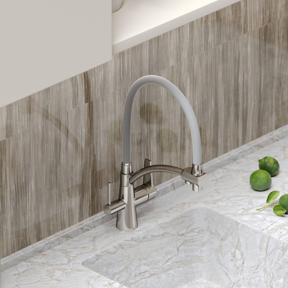 Смеситель для кухни SANCOS Eri с гибким изливом и возможностью подключения фильтра для воды, цвет брашированный никель, арт. SC4001BNС возможностью регулировки температуры водыАэратор, гибкая подводка, ключ и крепления для монтажа, ключ для обслуживания аэратора