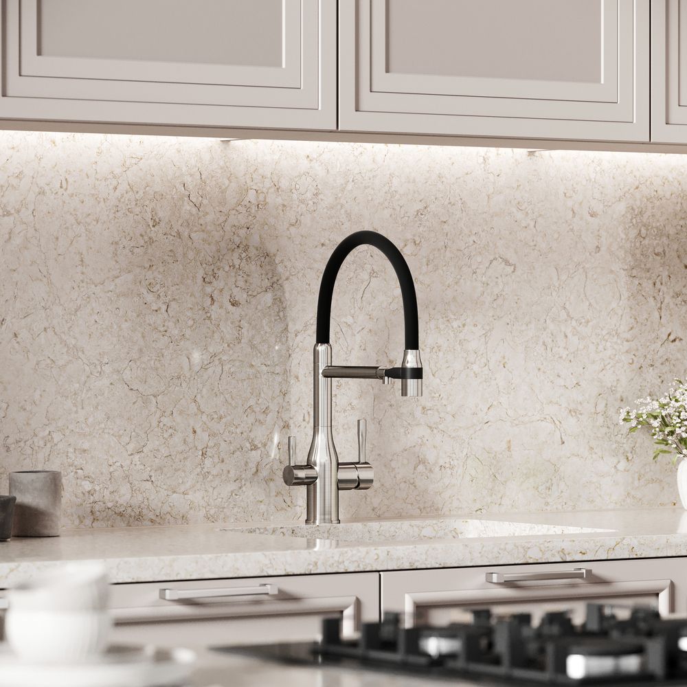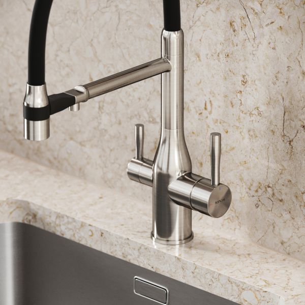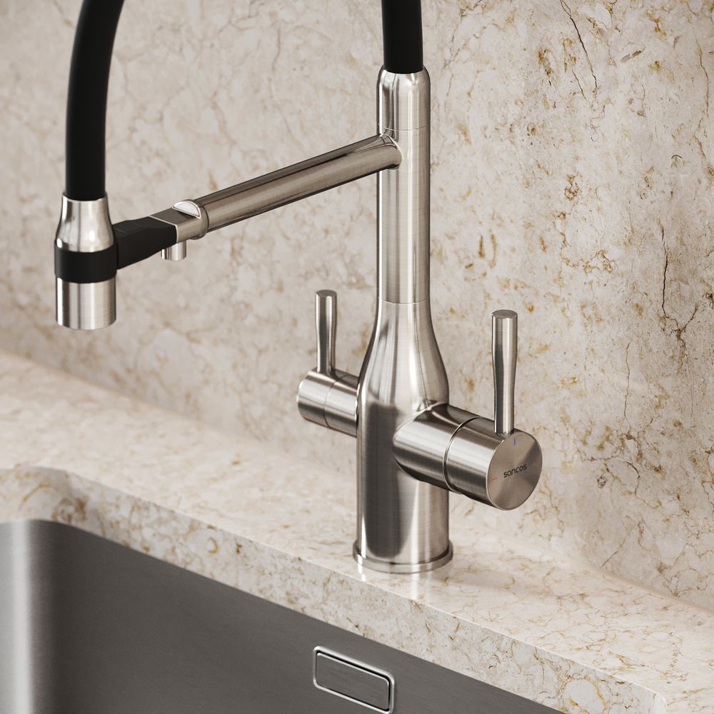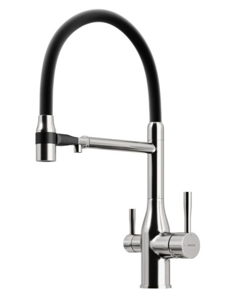 Смеситель для кухни SANCOS Garda с гибким изливом и возможностью подключения фильтра для воды, цвет брашированный никель, арт. SC4009BNФункция "Холодный старт" - при включении смесителя активируется холодной поток, для экономии горячей водыАэратор, гибкая подводка, ключ и крепления для монтажа