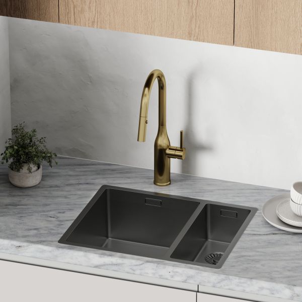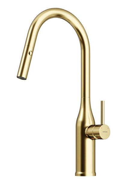 Смеситель для кухни SANCOS Grand c вытяжным и поворотным изливом, цвет брашированное золото, арт. SC4002BGС возможностью регулировки температуры водыАэратор, гибкая подводка, ключ и крепления для монтажа, ключ для обслуживания аэратора