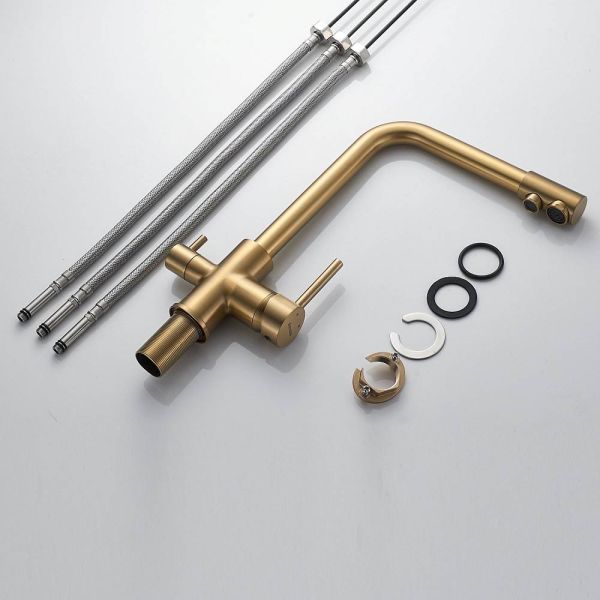 Во-первых, цвет "золотой сатин" подойдет к любому дизайну кухни и будет гармонично смотреться в любом интерьере. Во-вторых, поворотный излив позволит легко настроить струю воды под любые ваши нужды, а встроенный канал для питьевой воды облегчит процесс фильтрации и подачи воды.