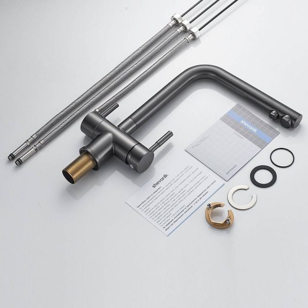 Смеситель для кухни Shevanik S468T - идеальный выбор для вашей кухни, выполненный в цвете оружейной стали, он придаст особый шарм интерьеру. Высокий поворотный излив обеспечивает комфортное использование, а канал для питьевой воды делает смеситель удобным для фильтрации воды. Изготовлен из прочной и долговечной латуни, смеситель гарантирует долгий срок службы. Специальное немаркое покрытие упрощает уход, а 5-летняя гарантия подтверждает качество продукта