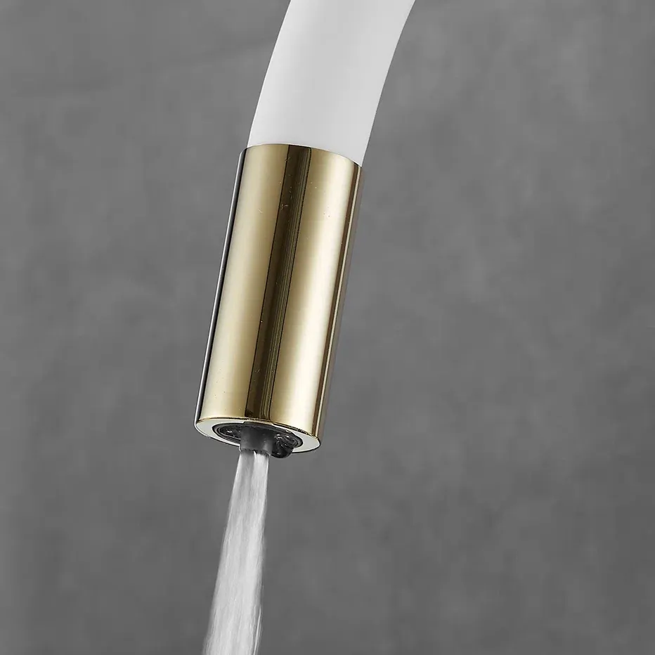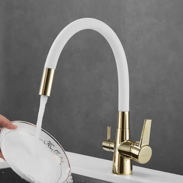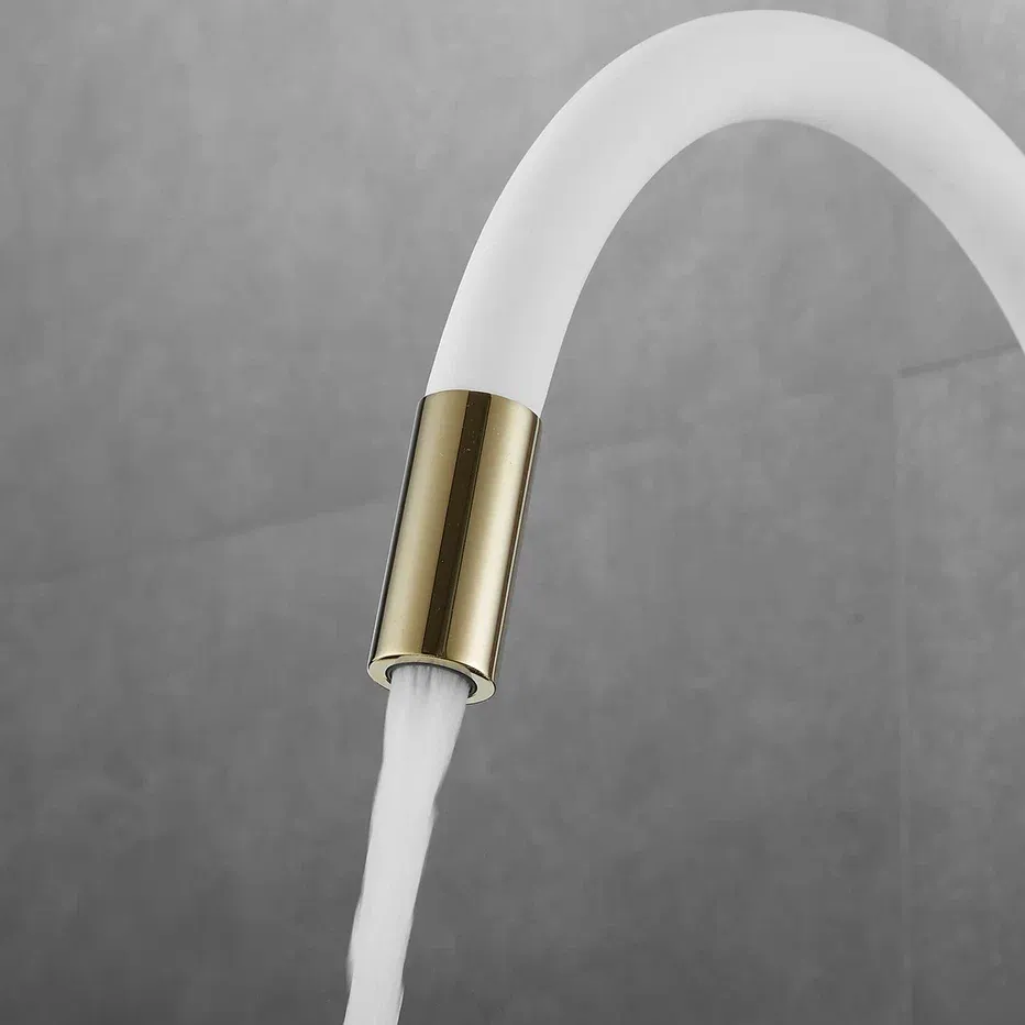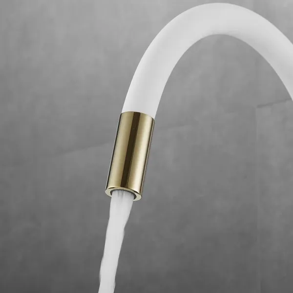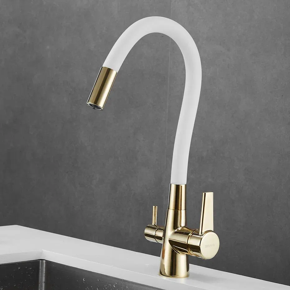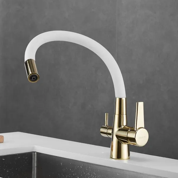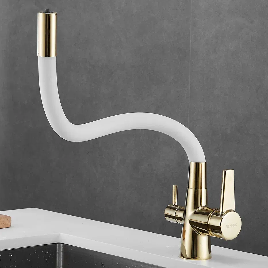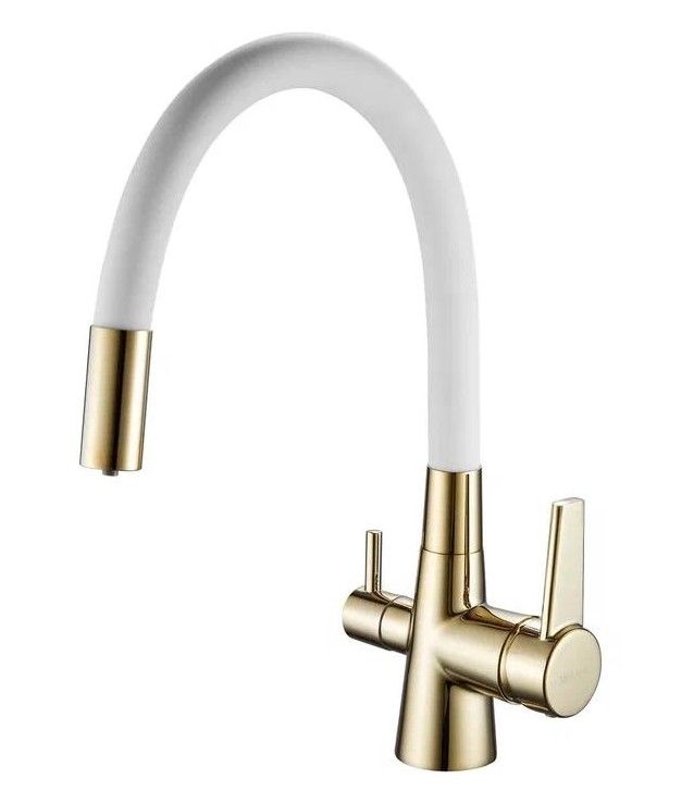 Смеситель для кухни с гибким изливом и подключением фильтра Shevanik S668E, золото/белый.Управление: рычажное.Вращение излива: да.Выдвижной излив: нет.Гибкий излив: да.Высота:33,5.